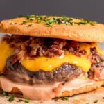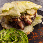 Hamburguesa grass-fed envuelta en lechuga, con queso, bacon y nuestra salsa secreta.