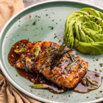 Filete de salmón a la parrilla en nuestra salsa keto de sésamo dulce. Acompañado de una porción de aguacate.