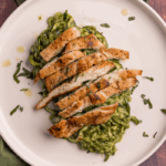 Pollo orgánico de libre pastoreo a la plancha sobre "spaghetti" de zucchini con nuestro pesto casero.