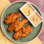 Pechuguitas crujientes de pollo orgánico y de libre pastoreo. Elige tu guarnición y tu salsa.