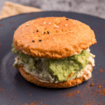 Relleno de pollo orgánico de libre pastoreo deshilachado, guacamole, queso y nuestra salsa alioli, en pan keto a base de harina de almendras.