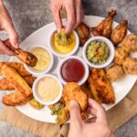 Para compartir: Chicken & Cheese Bombs, Tequeños y Chicken Wings. Elige hasta 3 salsas.