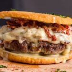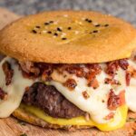 Hamburguesa grass-fed en pan 100% keto, con quesos derretidos, bacon y un toque dulce de nuestra salsa Honey Mustard keto.