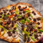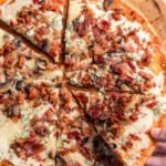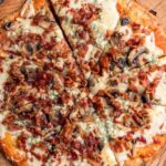 Con blue cheese, mezcla de quesos, bacon crujiente y champiñones salteados, en masa 100% keto a base de harina de almendras.