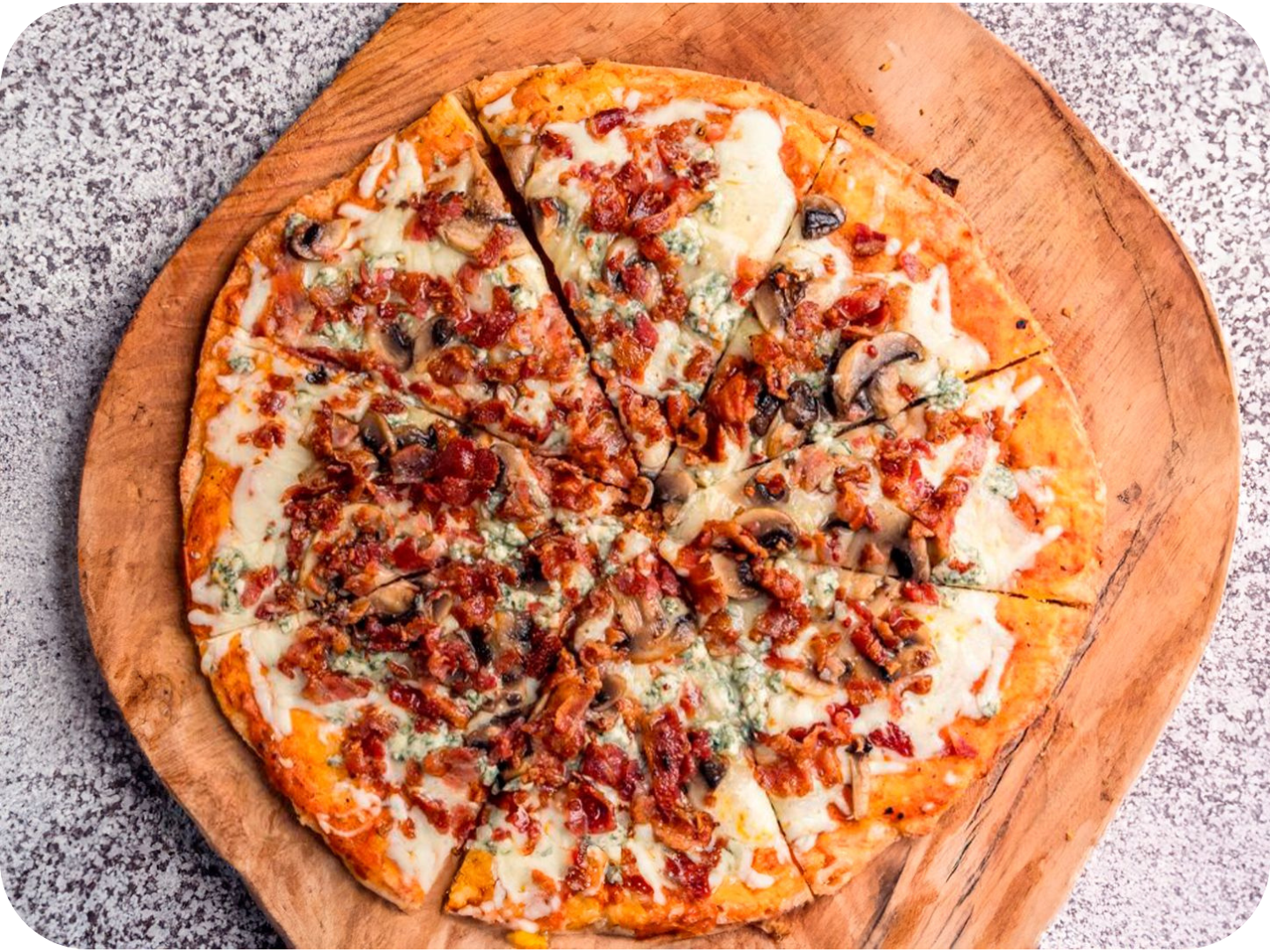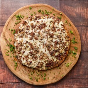 Con blue cheese, mezcla de quesos, bacon crujiente y champiñones salteados, en masa 100% keto a base de harina de almendras.