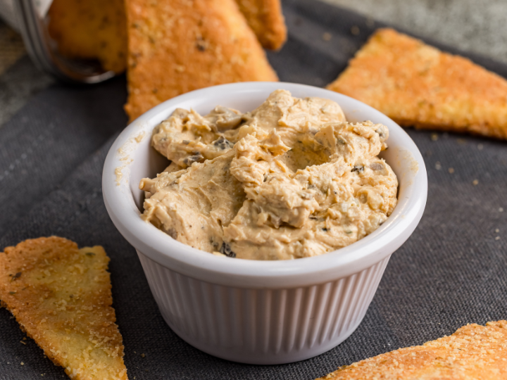 Dip keto y cremoso a base de queso, champiñones salteados y ajo, acompañado de keto chips para picar o dipear.