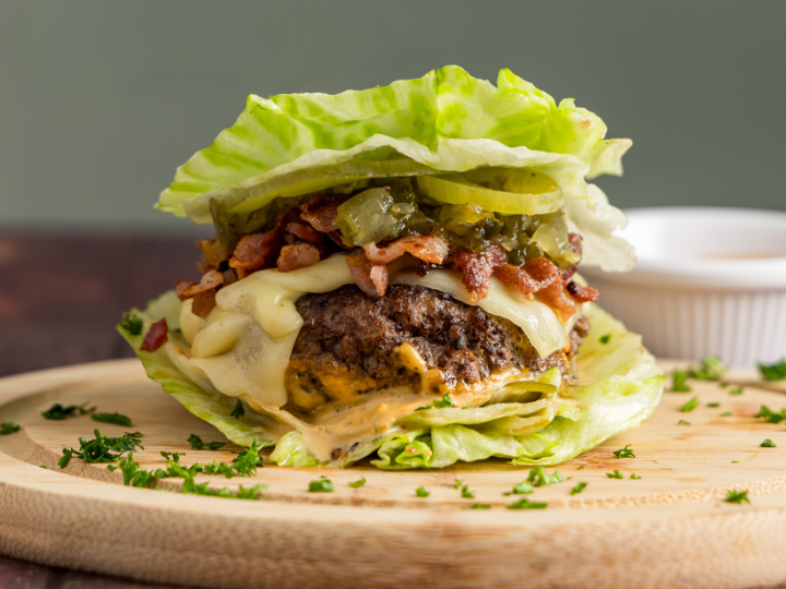 Hamburguesa grass-fed envuelta en lechuga, con queso, bacon, pepinillos sin azúcar y nuestra salsa ligeramente picante.
