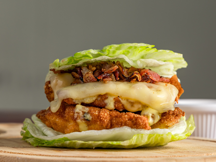 Pollo crujiente 100% keto envuelto en lechuga con queso, bacon y nuestra Capital Mayo elaborada sin azúcar y sin aceites de semillas.