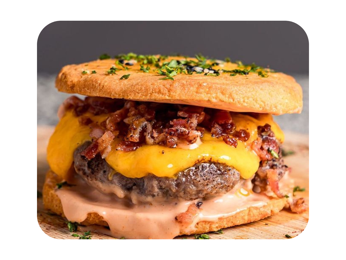 Hamburguesa grass-fed en «pan» 100% keto, con queso cheddar derretido, bacon, champiñones salteados y un toque de nuestra salsa rosada.