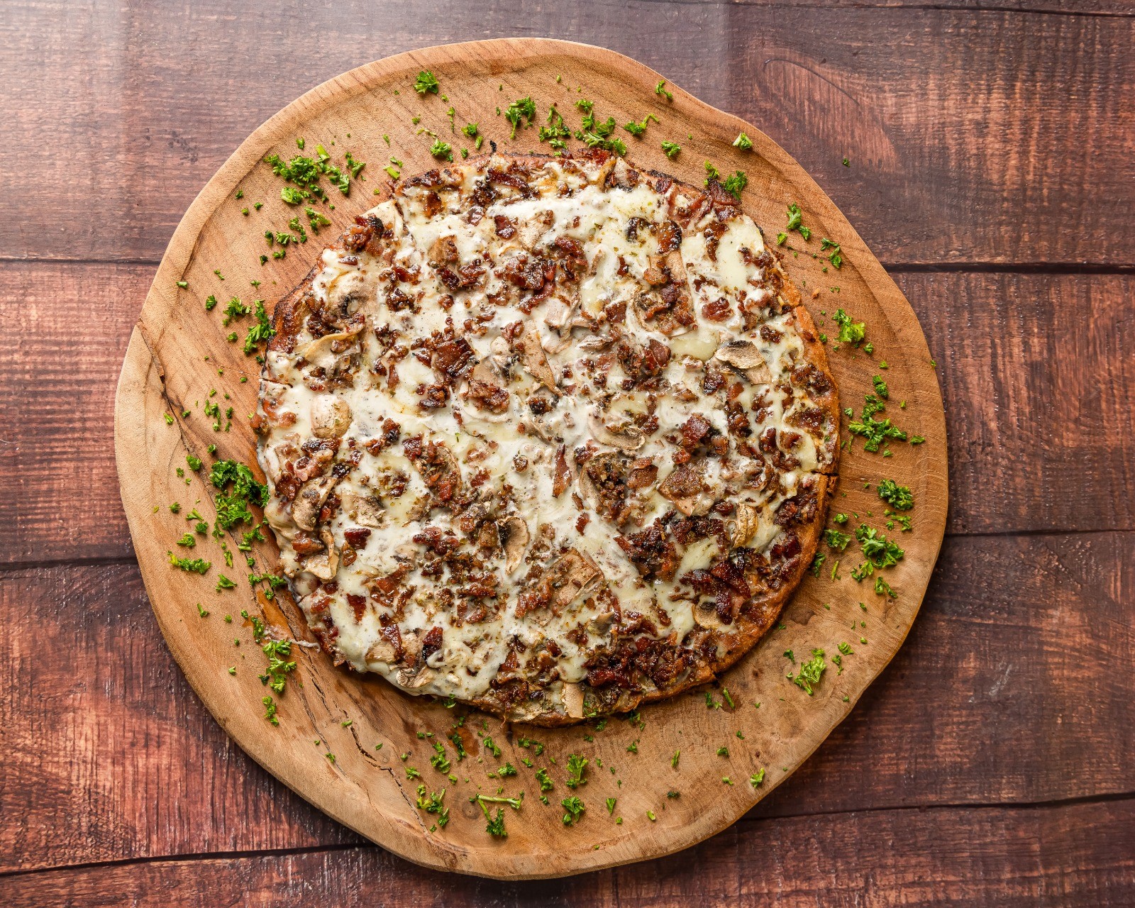 Con bacon, hongos y nuestra salsa carbonara keto. En masa 100% keto a base de harina de almendras.