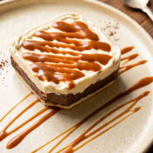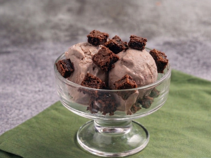 Helado hecho con proteína whey de pastoreo acompañado de toppings de brownie sin azúcar y sin gluten.
