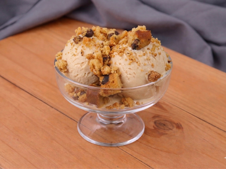Helado hecho con proteína whey de pastoreo acompañado de toppings de cookies sin azúcar y sin gluten.